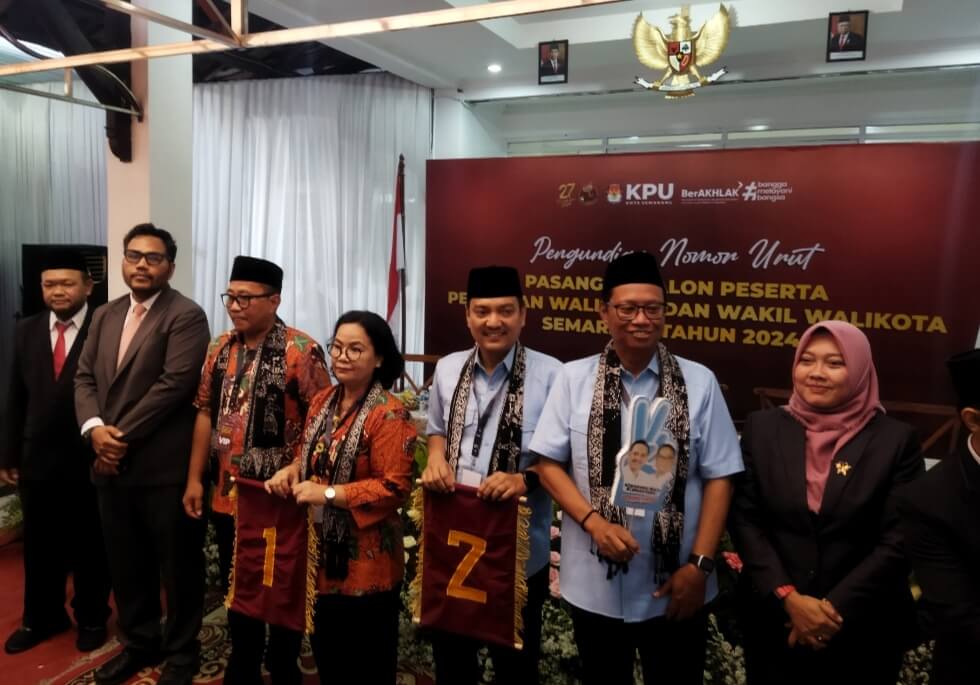 SEMARANG[BahteraJateng] – Pasangan Agustina Wilujeng Pramestuti dan Iswar Aminuddin (Agustin-Iswar) mendapatkan nomer urut 1 dan pasangan Alamsyah Satyanegara Sukawijaya atau Yoyok Sukawi dan Joko Santoso (Yoyok-Joss) mendapat nomer urut 2 dalam Pilwakot Semarang 2024.