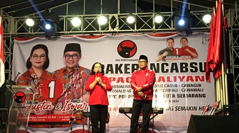 Agustina Wilujeng Pramestuti dan Iswar Aminuddin hadir di pamungkas Rakerancabsus PDI Perjuangan Kota Semarang yang digelar PAC Kecamatan Ngaliyan, Rabu (9/10) malam. Ragam program sebesar-besarnya APBD untuk warga Semarang dibeberkan di hadapan sekitar 800 massa yang hadir.