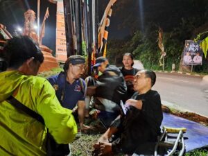 Alip Budiarto relawan difabel bersama Mujijono (memakai blangkon) dan relawan lain di Posko Mudik Gombel, Kota Semarang, Kamis (27/3/2025) malam.
