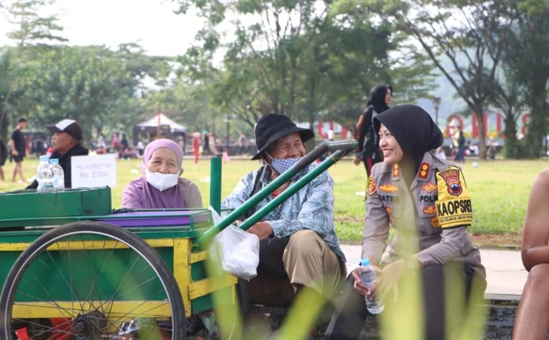 Kapolres tampak berbaur dengan anak-anak dari TK Kemala Bhayangkari 33 yang turut memeriahkan acara. Tak hanya itu, ia juga mengajak anak-anak lain yang berada di sekitar Alun-Alun untuk bergembira bersama.